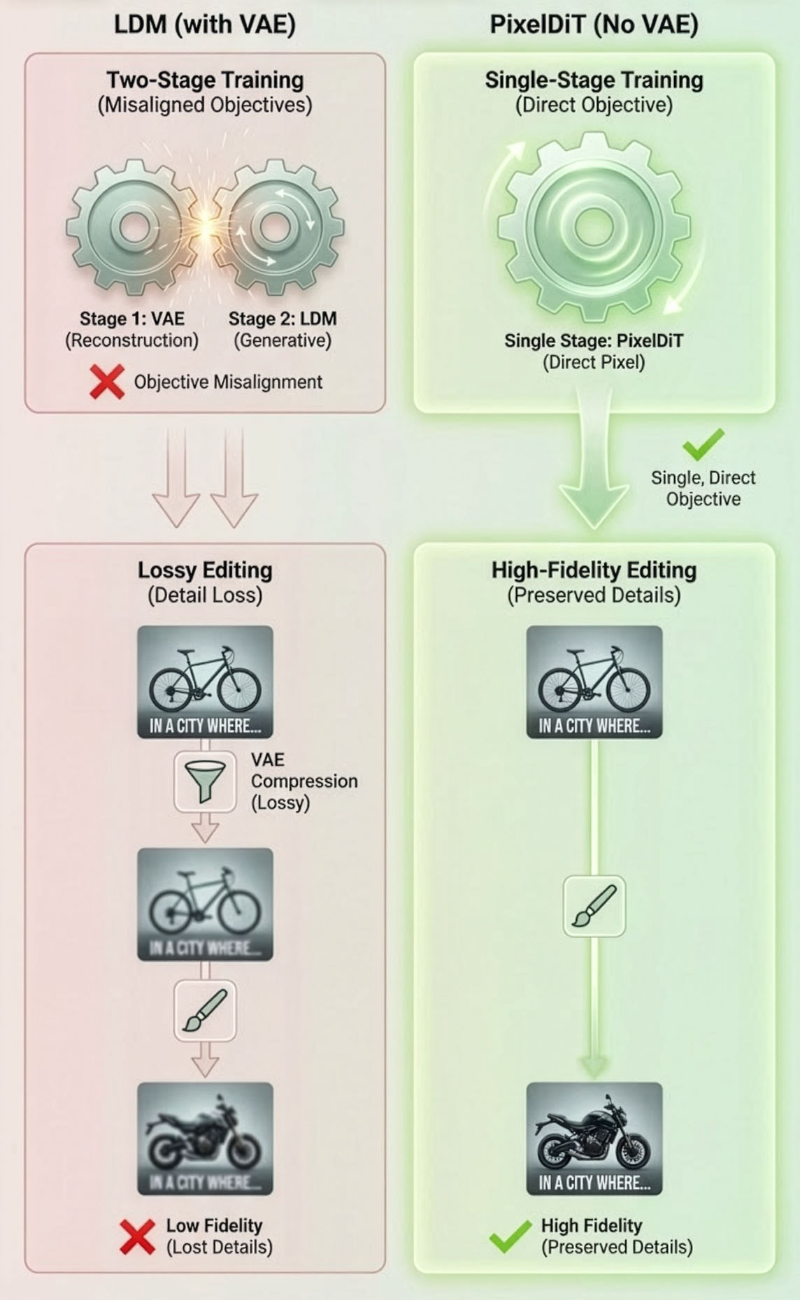 - × Lossy Reconstruction: VAEs blur high-frequency details (text, texture).